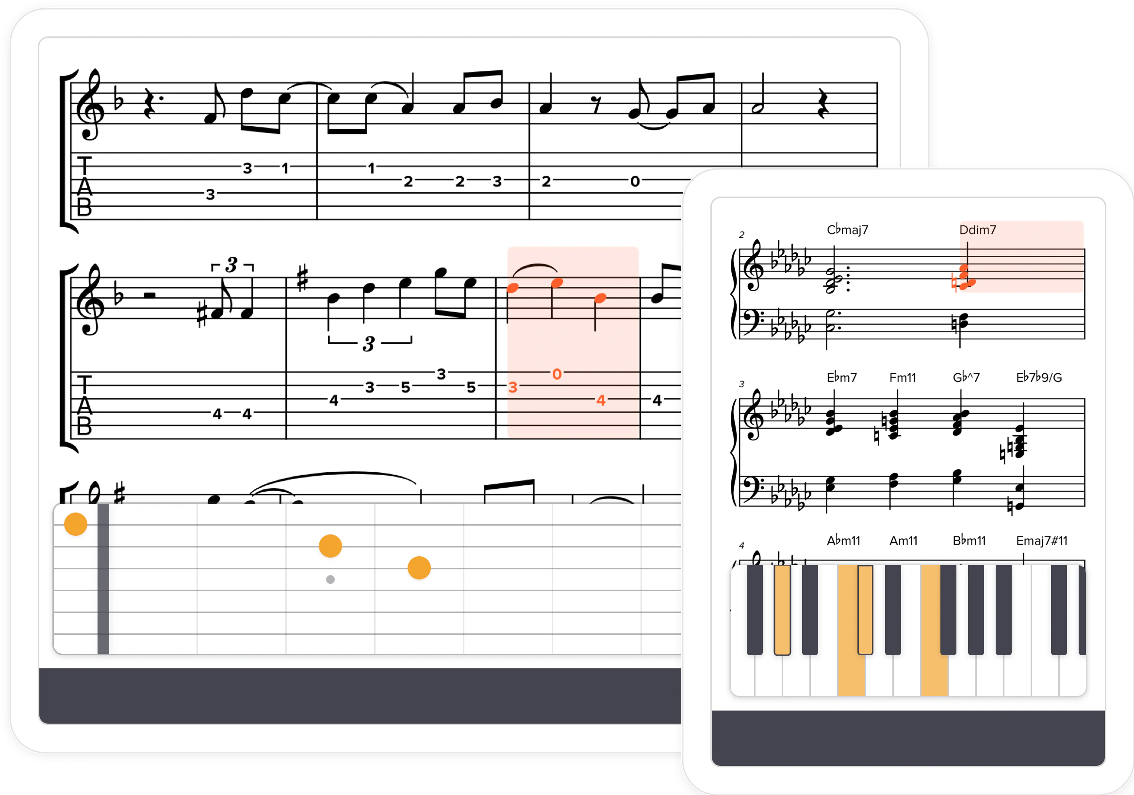 Finally, web-based notation software that treats tablature with respect. We natively support nearly every kind of tab marking: bends, slides, harmonics, tapping and more. No need to hack around your notation software to make proper tab.