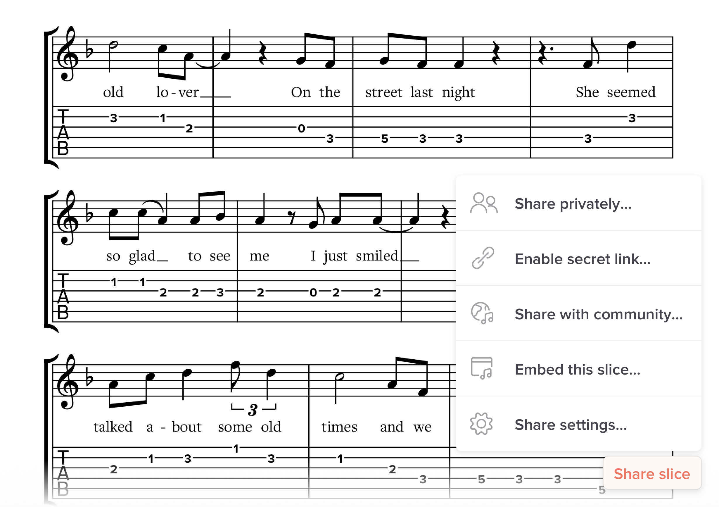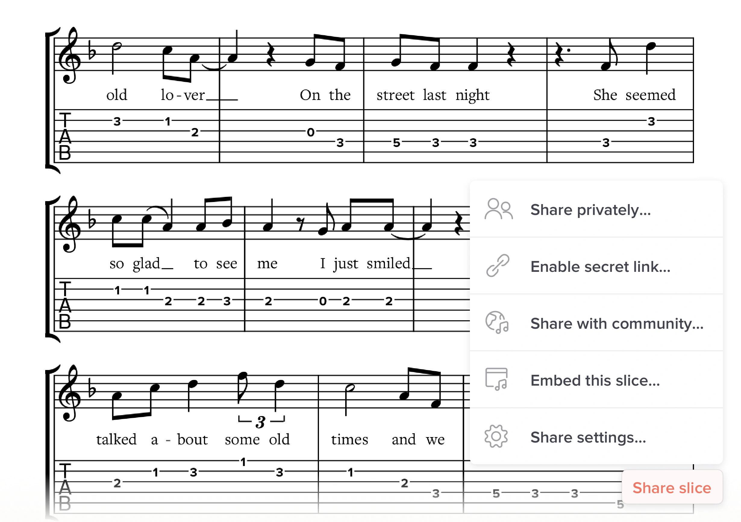 With Soundslice, you create something more interesting than sheet music. You create an interactive practice environment that integrates notation with real human performances and learning tools.
