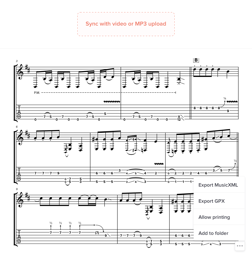 Export to other programs. Want to polish your notation in another app? Export your created slices as MusicXML (suitable for Sibelius, Finale, etc.), MIDI (for DAWs) or GPX (Guitar Pro format).