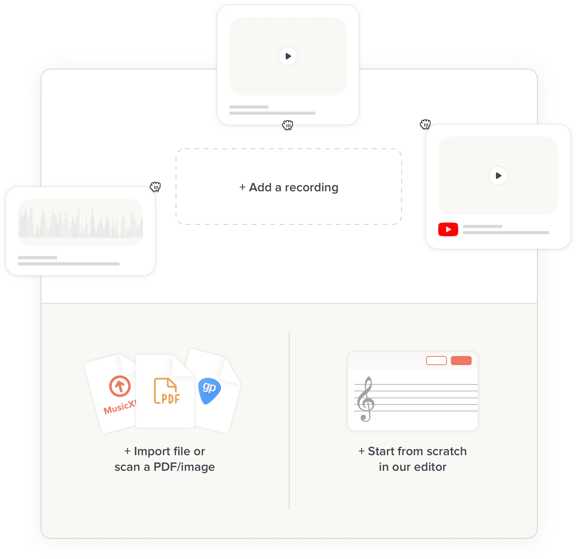 Use our import features if you have existing music. Our PDF/image scanner works on photos or PDFs, and we also read some native file formats (MusicXML, Guitar Pro and more).