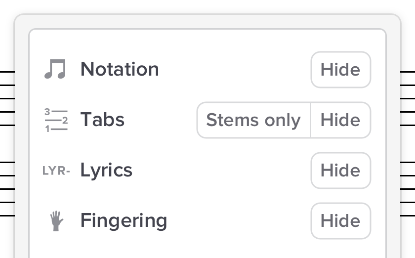 Quickly show/hide standard notation, fingering, lyrics, chord names and more.