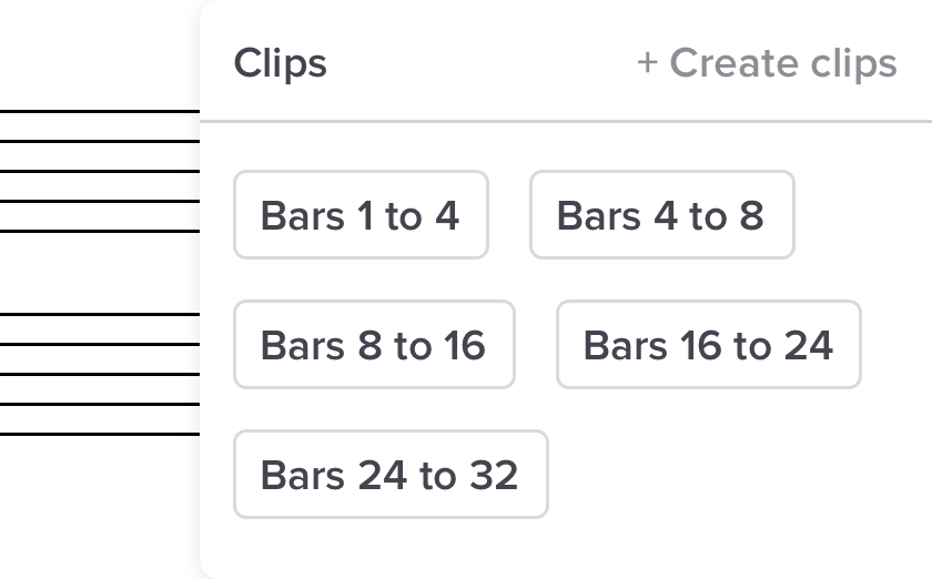 Select any range of bars and we’ll hide all other notation (and audio). Save these as “clips” for easy access later.