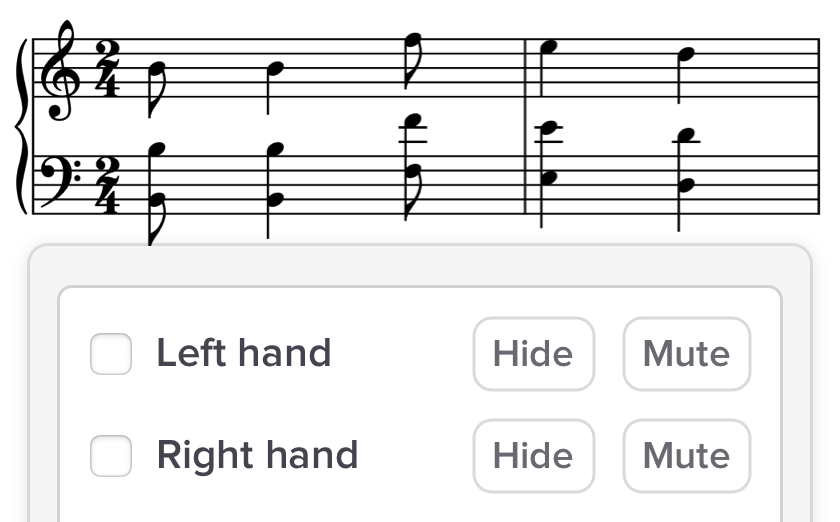 Quickly hide or mute either hand. See and hear only the part you’re practicing.