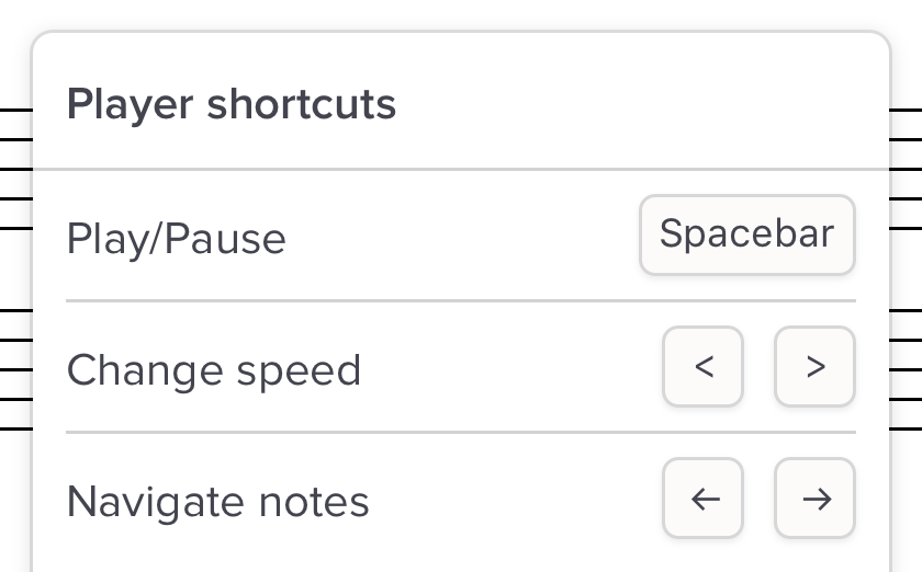 Quickly play/pause, change speed, navigate the notation and zoom in/out with keyboard shortcuts.