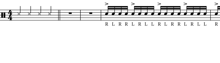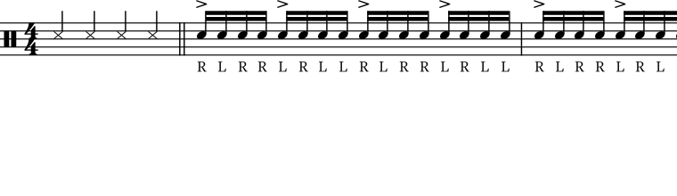 Suggerisco di studiare i rudimenti utilizzando anche gli arti inferiori, piede destro su ogni beat e piede sinistro sul secondo e quarto beat.