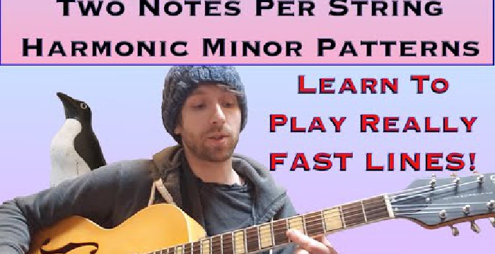 This lesson will show you how to play super fast using a modified Harmonic Minor scale. I designed these patterns specifically to have 2 notes per string and use only half steps on each string. This ends up with lines that are really easy to pick and have a Django Reinhardt like sound. In fact, you can play all of these patterns with only 2 fingers.