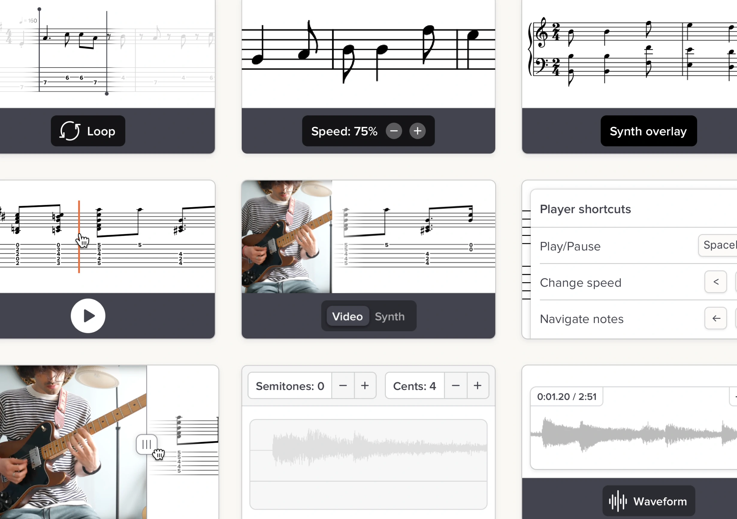 No, transcribing is just one part of Soundslice. We’ve got a whole suite of tools for learning, practicing and teaching music. Check out our practice features, notation editor and PDF/image importer.